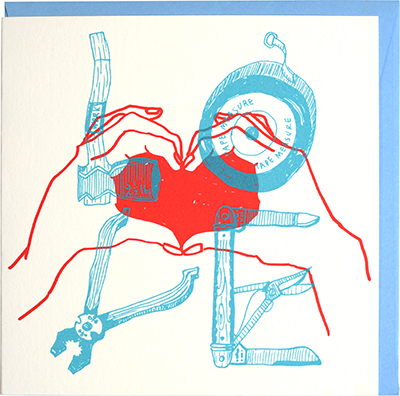 size: 140 x 140 mm (hold) card: bamboo paper envelope: kraft paper (brown) print colour: blue&red silk-screen printed by hand in japan price: 550yen (tax included)