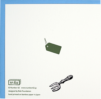 size: 140 x 140 mm (hold) card: bamboo paper envelope: kraft paper (brown) print colour: black&moss green silk-screen printed by hand in japan price: 550yen (tax included)